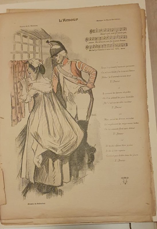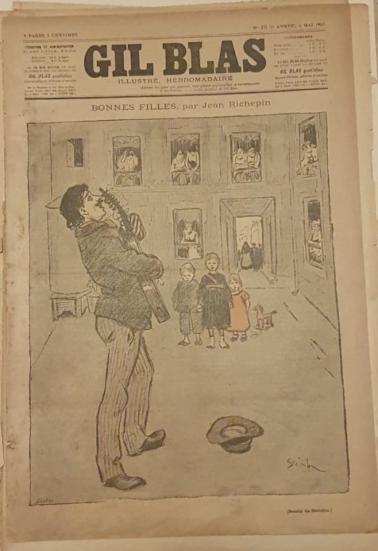 Goedenavond. Ik heb een map vol met oude krantebladen van de oude franse krant Gil Blas. Het betreffen voorbladen en bladzijdes met muziek. Ze zijn verlucht met tekeningen van o.a Steinlein en dateren rond 1893. De staat is niet smetteloos. Sommige randen zijn gerafeld en de meesten zijn wat verkleurd. Hebben deze tekeningen/publicaties nog enige waarde kunsttechnisch gezien of financieel? Mvg Marcel