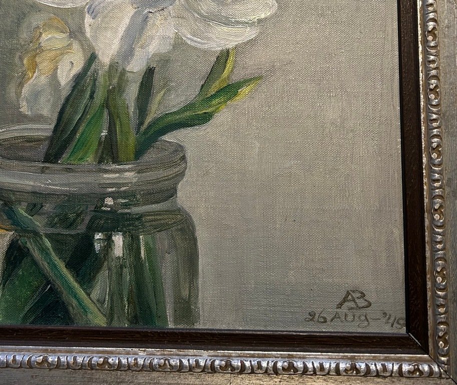 En mooi bloemstilleven! Maar wie heeft het geschilderd in 1949? Alle informatie welkom. Alvast bedankt.